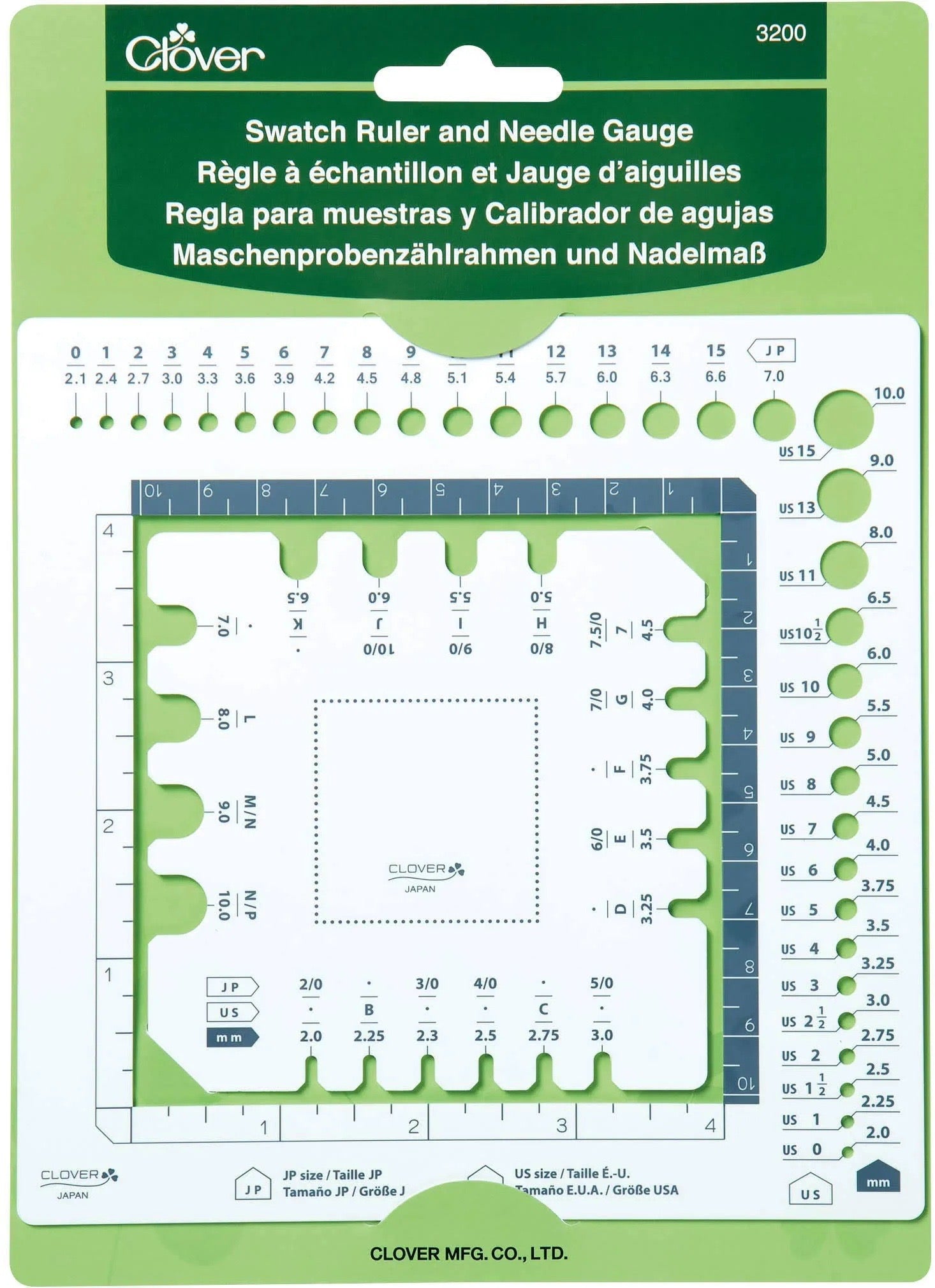 Clover Swatch Ruler and Needle Gauge A multi-purpose tool for knitting and crochet. The Swatch Ruler allows you to isolate a section of your work to easily count both stitches and rows. This 6.25x8.625 inch package contains one swatch ruler and one needle gauge.