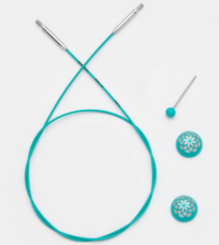 The Mindful Collection Cables works with all KnitPro needles. Strong and flexible, made of finest grade material. Smooth-coating and teal in colour. Memory free for no twisting. Offered with teal coloured end caps with the floral print are a delight to use and the cable keys used for tightening the tips to the cable come with a colour coordinated top.