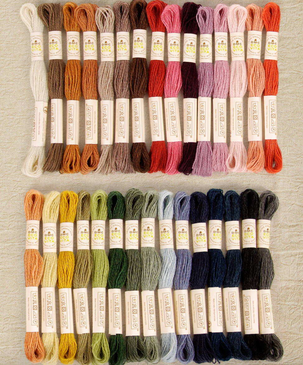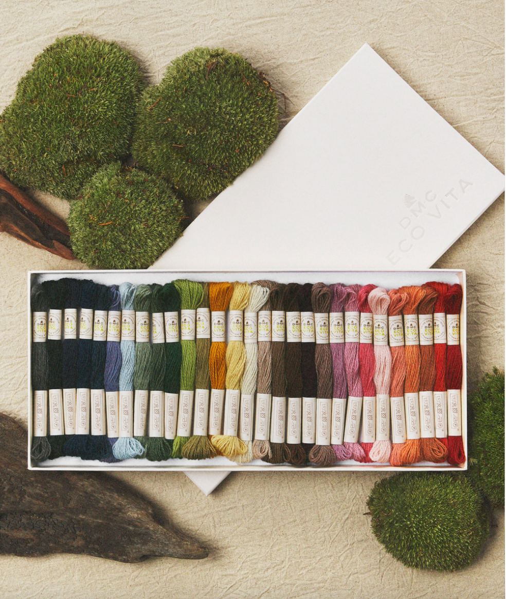 This limited edition high-quality card box includes 30 full-sized, 16m skeins of Eco Vita Organic Naturally Dyed Organic Wool Thread. There are two free patterns included to inspire you to start stitching with this extraordinary, sustainable thread.