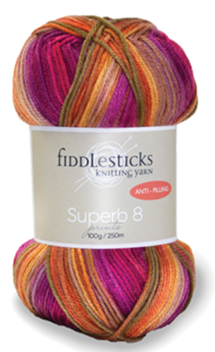 Fiddlesticks Superb 8 Prints is the latest addition to their collection of superior 100% anti-pilling acrylic. This yarn is luxuriously soft and a beautiful blend of colours that are perfect for knit & crochet projects working with DK / ply weight yarn.