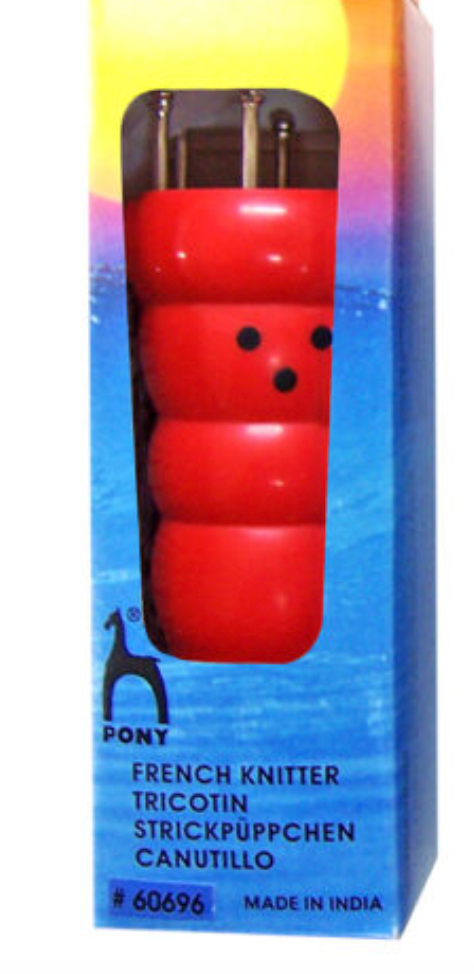 The Pony French Knitter consists of a knitting spool and a pin. The four brass pins on the French Knitter produce a narrow tube which could be used as braids and other simple coiled projects such as caps and coasters.