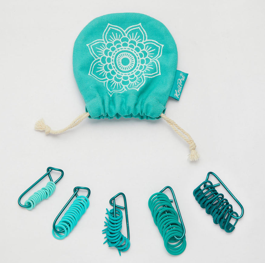 A multi-use teal coloured cloth bag holds all the stitch markers.
