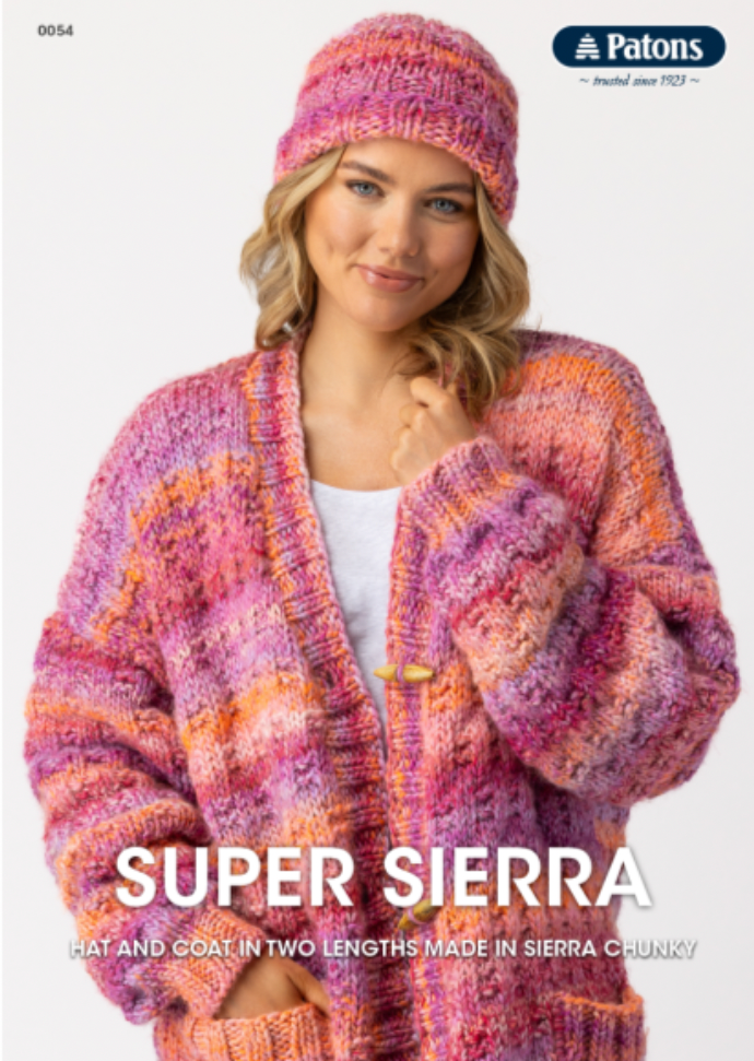 Gloriously snuggly coat with handy pockets, two length options and a matching hat in Patons Sierra Chunky. Sizes S - XXL
