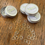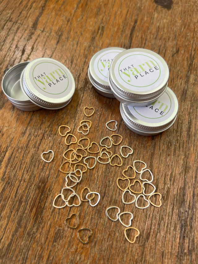 A tin of 30 heart shaped metal stitch markers. A sweet addition to your knitting kit.