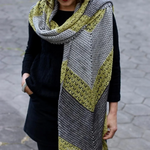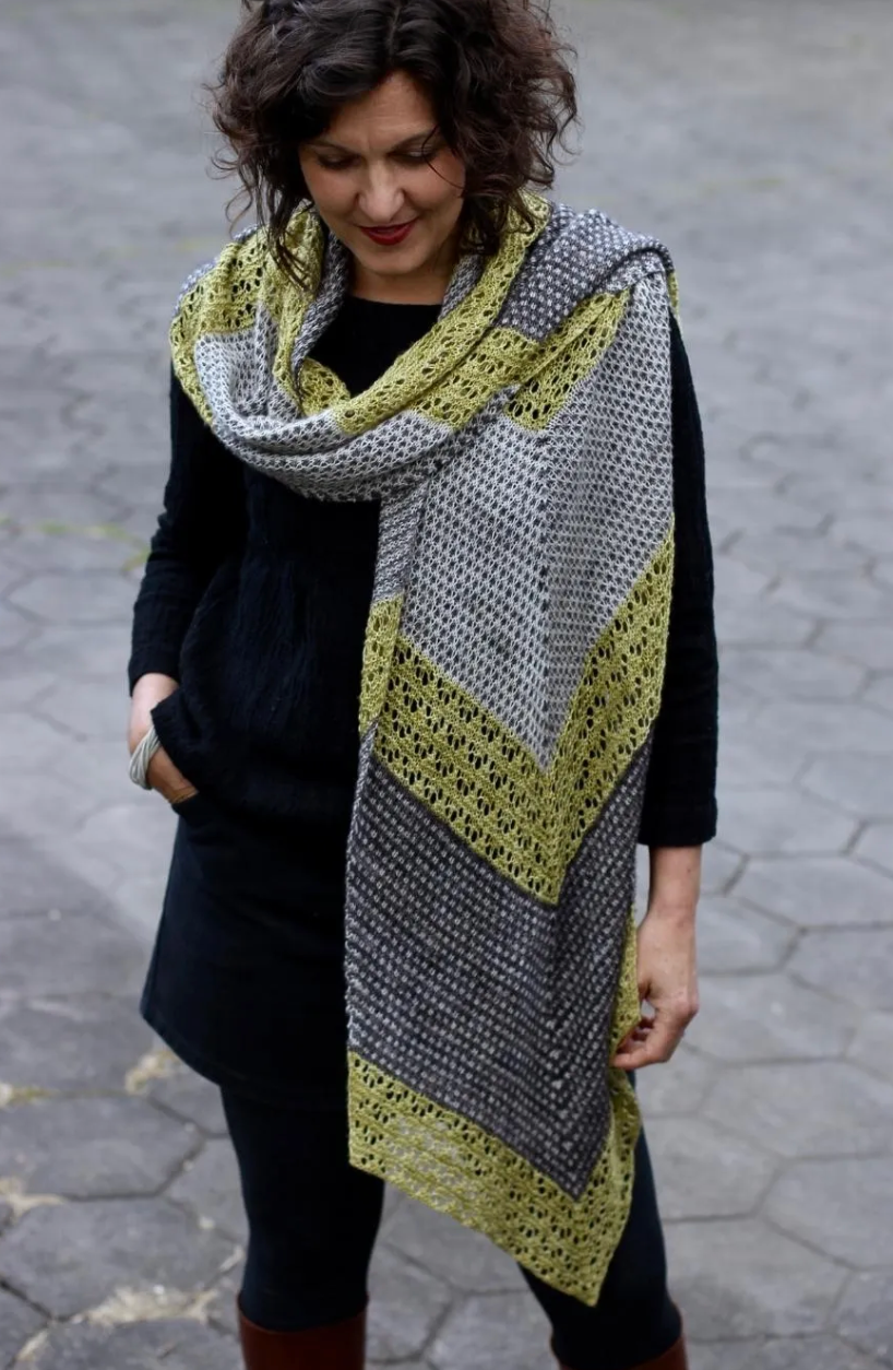 Knitted from end to end, Electra is a long, slim, arrow-shaped wrap, with a funky tail at one end and a lace point at the other. You’ll begin at the tail with gutsy lace, move to slipped stitches that knit into a delicious honeycomb, and then relax into an easy rhythm of lace and honeycomb and back again.